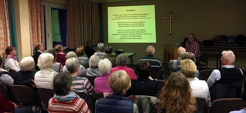 Sing-mit-Konzerte erfreuen sich momentan großer Beliebtheit; in dieser Form fand überraschenderweise die gestrige Chorprobe statt, eine Liederreise durch verschiedenste Genres. „Das hat großen Spaß gemacht“ war die einhellige Meinung aller, nachdem man fast drei Dutzend Volkslieder, Spirituals, Popsongs und Schlager gesungen hatte und die Zeit wie im Flug vergangen war.