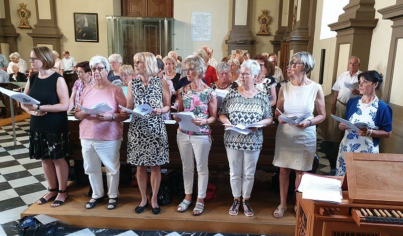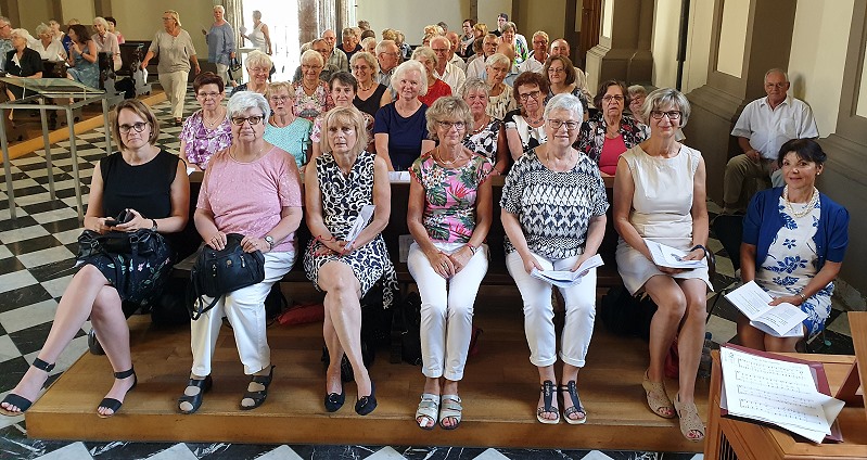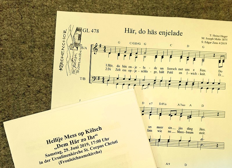 Auf Einladung des Heimatvereins Alt Köln e. V. gestalteten wir dessen Gottesdienst für die Vereinsmitglieder in der Fronleichnamskirche der Ursulinen  mit mehrstimmigen Messgesängen in kölscher Mundart. Winfried Krane war mit dabei und spielte die Orgel. Das Kultlied „De Jlocke vun Kölle“ durfte natürlich nicht fehlen, ebenso nicht „das Kölsch hernach“ bei Gaffel.