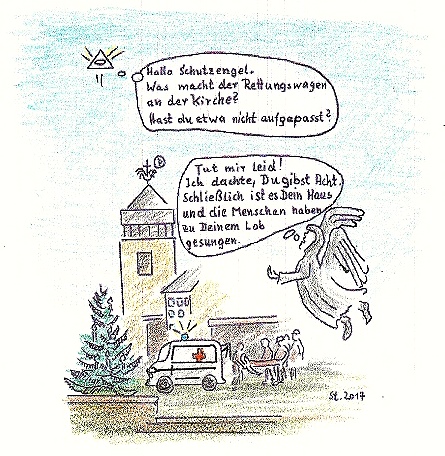Als am zweiten Weihnachtstag während unseres Singens im Gottesdienst der Rettungsdienst alarmiert werden musste, weil eine Sängerin gestürzt war, fuhr uns allen der Schreck durch die Glieder. Unser Karikaturist Bruno Stephan stellt sich nun die Frage nach der „himmlischen Zuständigkeit“ für diesen Unfall.